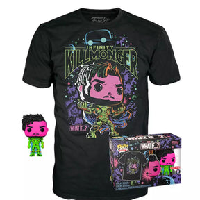The Funko POP! Marvel What If...? Infinity Killmonger Tee Bundle (Blacklight Reactive) includes a Funko POP! figure of Killmonger from the What If...? animated series, along with a blacklight-reactive t-shirt featuring exclusive artwork of the character. Both the figure and t-shirt feature vibrant colors that glow under blacklight, making this bundle a must-have for collectors and Marvel fans. This limited-edition set combines a striking collectible with a stylish, eye-catching tee that reacts to blacklight for a unique display effect.